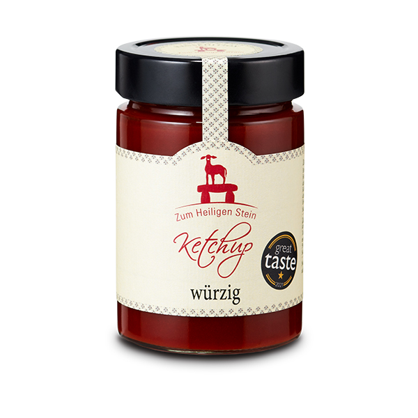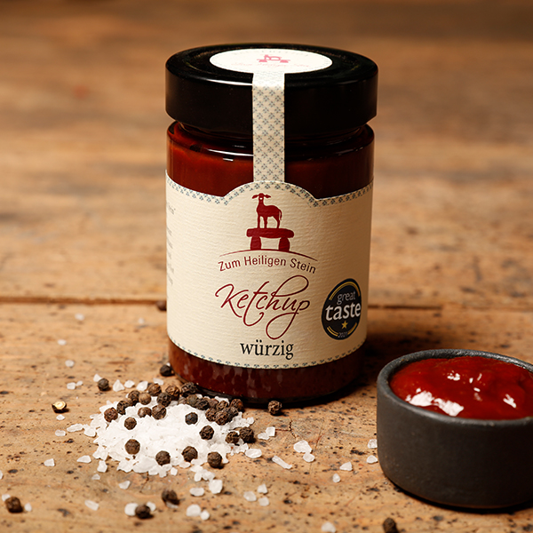 …verleihen dem Ketchup seinen unvergleichlichen Geschmack. Der handgemachte Ketchup der Marke “Zum Heiligen Stein” passt zu Fleisch, Fisch oder Gemüse. So ist der würzige Ketchup auf seine Art etwas ganz Besonderes. Nicht zu vergleichen mit einfachem Ketchup – dafür ist er viel zu lecker! Vegan
